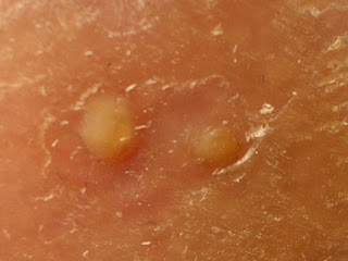 Al abrirlos sale al exterior un contenido seroso, espeso y de color amarillento verdoso compatible con una infección. Se le toman muestras y se manda al laboratorio para bacteriología. Mientras tanto, al ser una lesión superficial, pongo una descarga y antibiótico tópico en pomada, en este caso Dermisone Triantibiótica. Creo que el problema le ha venido a causa de la fricción que ha sufrido la zona de tanto caminar en las procesiones, fricción que ha sido causada por don pequeñas sobreelavaciones en el interior del calzado al salir un poco las cabezas de dos puntas.