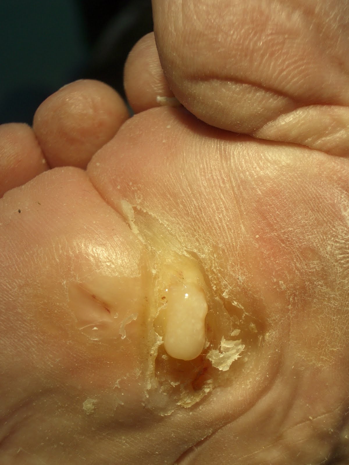 Cambiando de tema, el primer caso que pongo hoy es el de una mujer que vino con una verruga en el dorso del cuarto dedo del pie izquierdo. En primer lugar fue a un salón de belleza a que una esteticien le quitara el callito, callito que no le dejaba de doler auque iba cada 15 días a la esteticien la cual le decía que era un callito rebelde. Como la indocumentada e inútil de la esteticien, la cual no tenía ni puñetera idea a qué se estaba enfrentando, no le solucionaba el problema y la verruga cada vez iba creciendo mas, se fue al médico de cabecera a su centro de salud, el cua tampoco le diagnosticó una verruga y le dijo que era un callo, que fuese al podólogo. La mujer fue a una podóloga la cual con buen criterio le diagnosticó de verruga, pero no acertó en el tratamiento, recetándole antiverrugas Isdin (!un podólogo mandando antiverrugas Isdin!, como para presumir. Después de mes y medio de darse con el antiverrugas Isdin y ver como la verruga iba creciendo y doliendo mas, decide ir a otro podólogo, en este caso fue a nuestra clínica, donde nos llegó en el estado en el que podéis ver en la primera foto. La mujer ya estaba harta y todos los días se pintaba la verruga con mercromina.