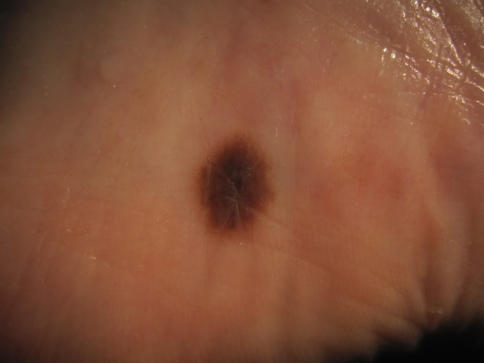 En principio sospeché de un nevus melanocítico, pero esa mancha a distancia y cerca de la grande me ha despistado y me ha hecho dudar de un diagnóstico de presunción. La miré por el dermatoscopio y aprecié que la parte central era mas negra y se estaba como deprimiendo, como comenzando a ulcerarse. Los bordes son mas bien regulares y definidos y la lesión es casi simétrica lo que son signos de no malignización pero la depresión central, el color mas oscuro en el centro, el crecimiento rápido, la mancha que está saliendo a tres centímetros y el que diga que le pica me hace sospechar que pueda ser un melanoma. Tal vez ha sido una lesión pigmentada que se ha malignizado. Le propuse extirparla totalmente con márgenes de seguridad y mandar la muestra a anatomía patológia, pienso que no merece la pena hacer biopsia, es mejor extirpar todo y analizarlo, pero la mujer dijo que le parecía muy caro, que si le podía hacer un informe para su médico de atención primaria y que la derivase al dermatólogo. Así lo hice, le realicé el informe con la foto del dermatoscopio y los posibles diagnósticos de presunción.