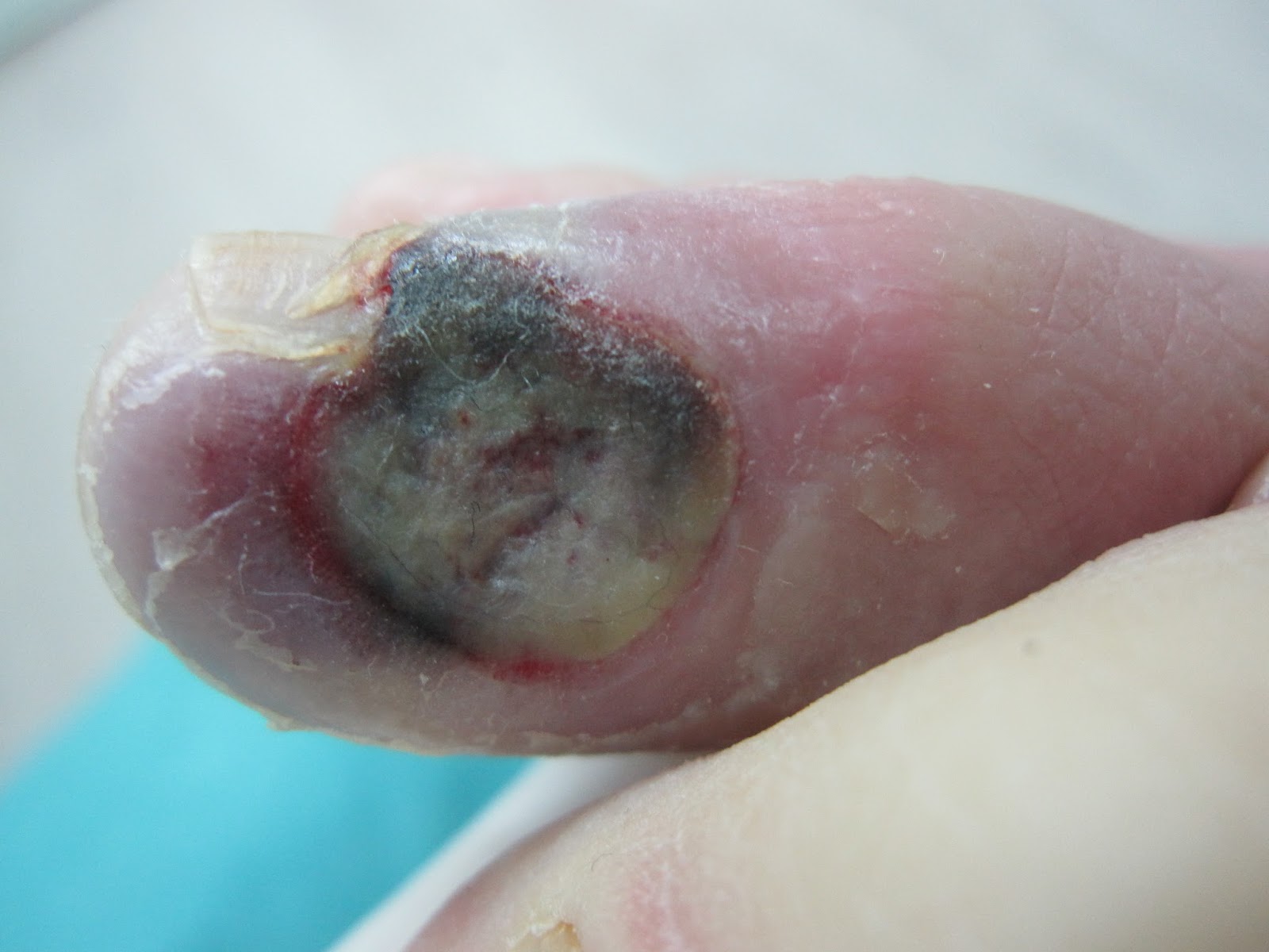 Y al día siguiente el aspecto del dedo es este. Hoy el dedo está peor. Vengo del hospital y la gangrena avanzó necrosando la mitad del dedo. No puedo poner fotos del día de hoy por que no llevé la cámara de fotos y no me di cuenta de hacerlas con el teléfono.